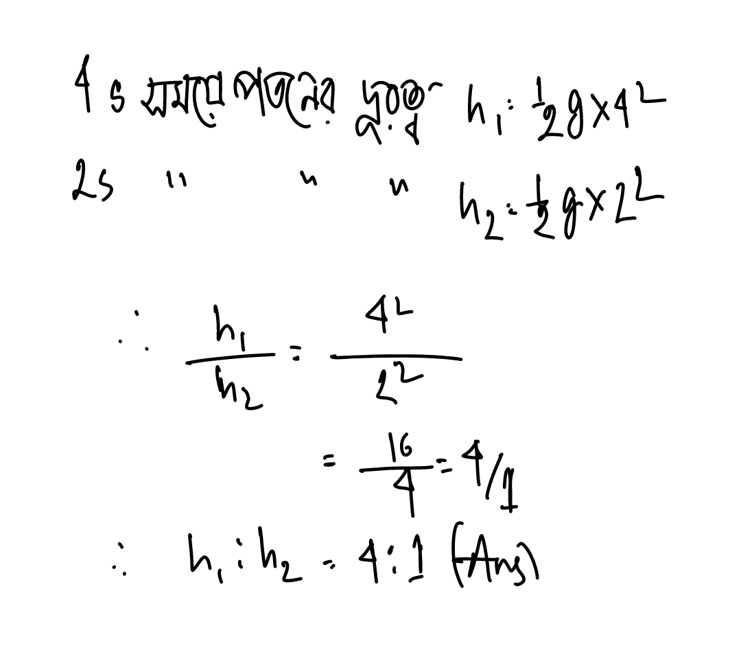 একটি পাথরকে স্থির অবস্থায় একটি উঁচু দালান থেকে ছেড়ে দেওয়া হলো। ভূমিতে পৌঁছাতে পাথরটির 4 s এর বেশি সময় লাগে। বাতাসের ঘর্ষণ ক্ষুদ্র হলে পাথরটির প্রথম 4s সময়ে পতনের দূরত্ব এবং প্রথম 2 s সময়ে পতনের দূরত্বের অনুপাত কত?