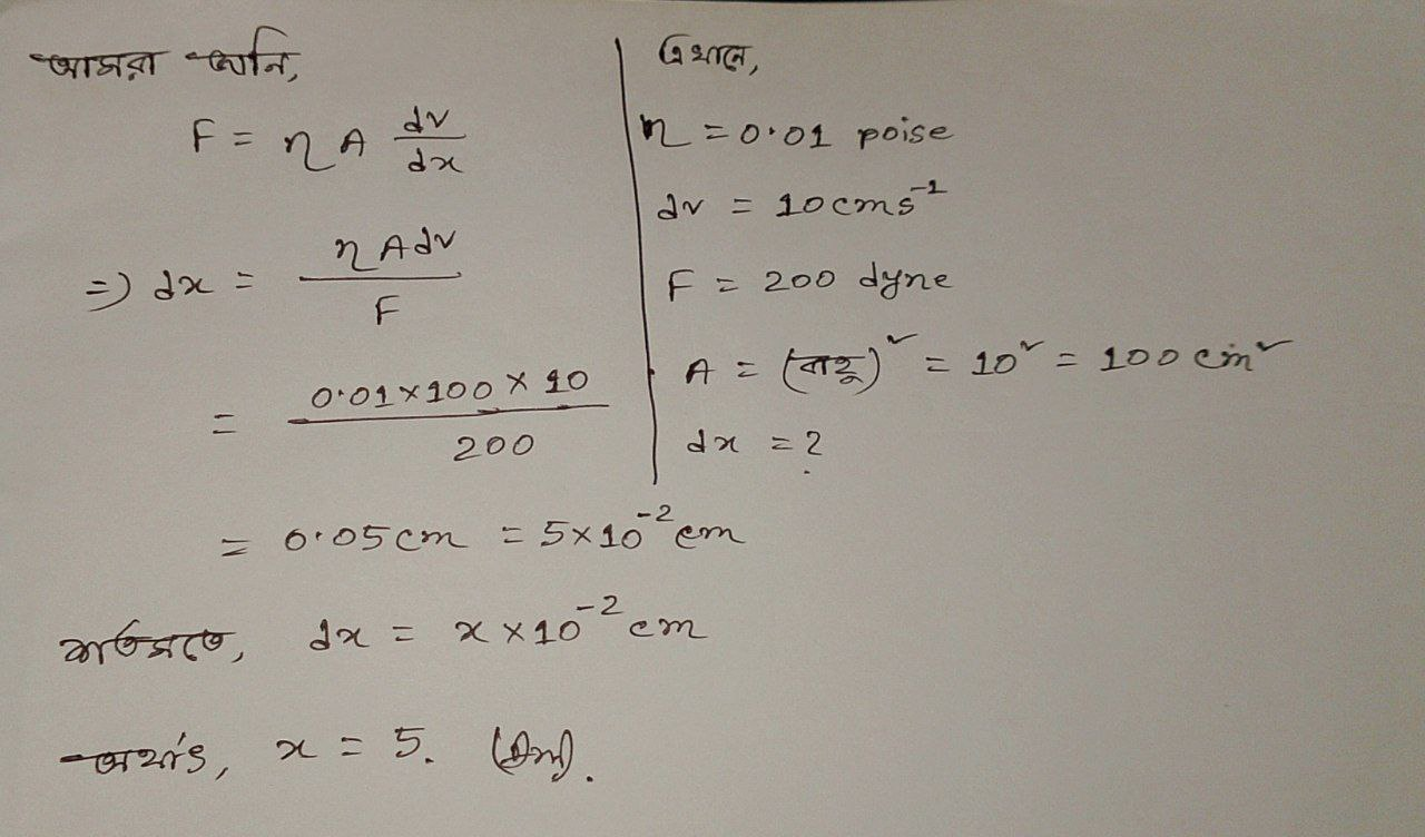 একটি বর্গপ্লেট এর অন্য প্লেটের সমান্তরালভাবে চলে যার গতিবেগ ; উভয় প্লেট পানিতে নিমজ্জিত। যদি বল 200 ডাইন এবং জলের সান্দ্রতা 0.01 পইজ হয়, তবে তাদের পৃথকীকরণ দূরত্ব হয়, তাহলে এর মান কত হবে ?