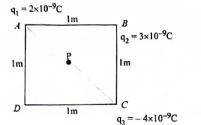 একটি বর্গের A, B, C তিনটি বিন্দুতে যথাক্রমে +2C, -3C ও +4C মানের 3টি চার্জ অবস্থিত। বর্গের এক বাহুর দৈর্ঘ্য 3 m।