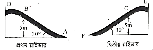 শিশুপার্কে চিত্রের ন্যায় দুটি স্লাইডার ব্যবহারের সময় সাবাবা গতির ভিন্নতা অনুভব করে। প্রথম স্লাইডের ঘর্ষণ বল । এবং দ্বিতীয়টি ঘর্ষণহীন। উভয় স্লাইডারের উচ্চতা সমান। সাবাবার ভর 20 kg। [AD = EF = 20 m]
