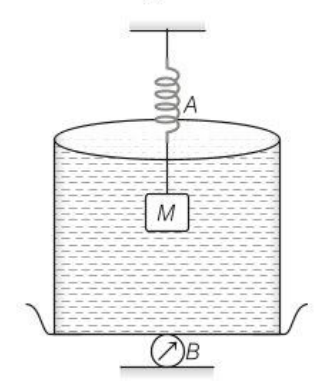 স্প্রিং ব্যালেন্স , ভরের একটি ব্লকের রিডিং দেয় । যখন এতে তরল যুক্ত একটি বিকার রাখা হয় তখন ব্যালেন্সটি রিডিং দেয়। দুটি স্প্রিং ব্যালেন্স এখন এমনভাবে সাজানো হয়েছে যে ঝুলন্ত ভরটি চিত্রে প্রদর্শিত ভাবে একটি বিকারে তরলের অভ্যন্তরে থাকে , এখন নিচের কোনটি সঠিক?