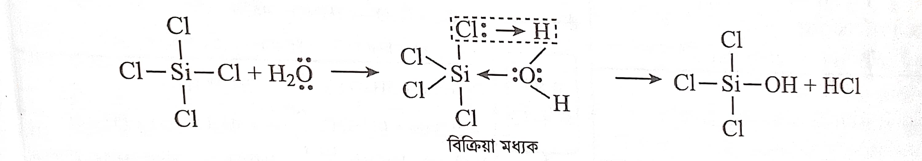 SiCl4 এর কেন্দ্রীয় পরমাণু সিলিকন(Si) পানির অনুর অক্সিজেন (O) পরমাণুর সাথে শনিবেশ বন্ধন গঠনের মাধ্যমে আদ্র বিশ্লেষিত হয়।