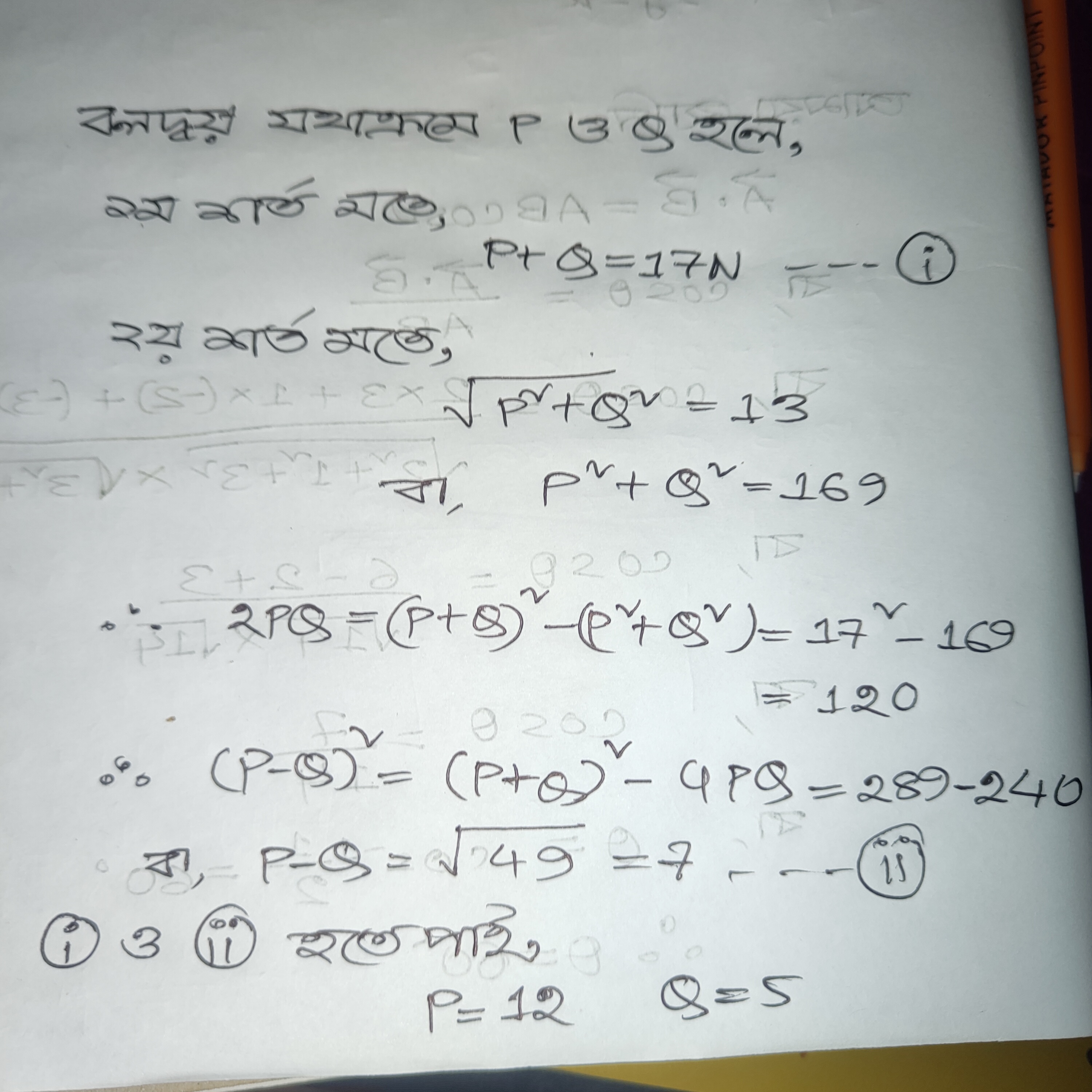 কোন বিন্দুতে ক্রিয়ারত দুইটি বলের বৃহত্তম লব্ধি 17N এবং তাদের অর্ন্তগত কোণ এক সমকোণে হলে লব্ধি 13N হয়। বলদ্বয় কত হবে?