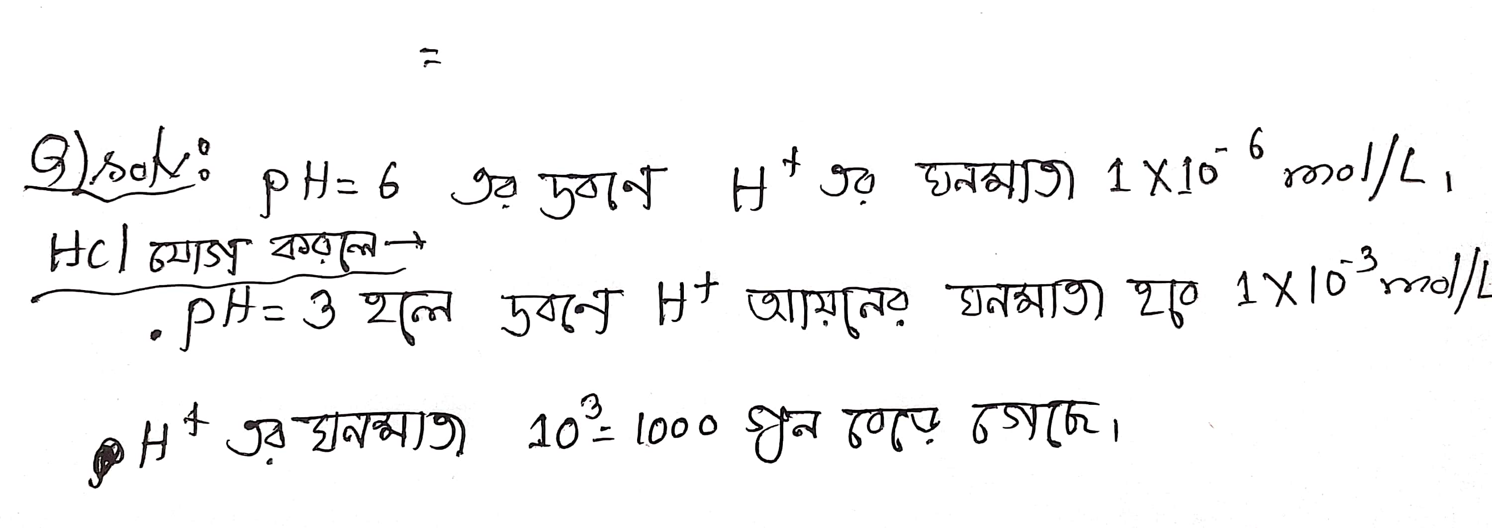 কোনো দ্রবণের pH = 6 দ্রবণটিতে আরও HCI যোগ করায় pH 3 হয়। আয়নের ঘনমাত্রা বেড়েছে-