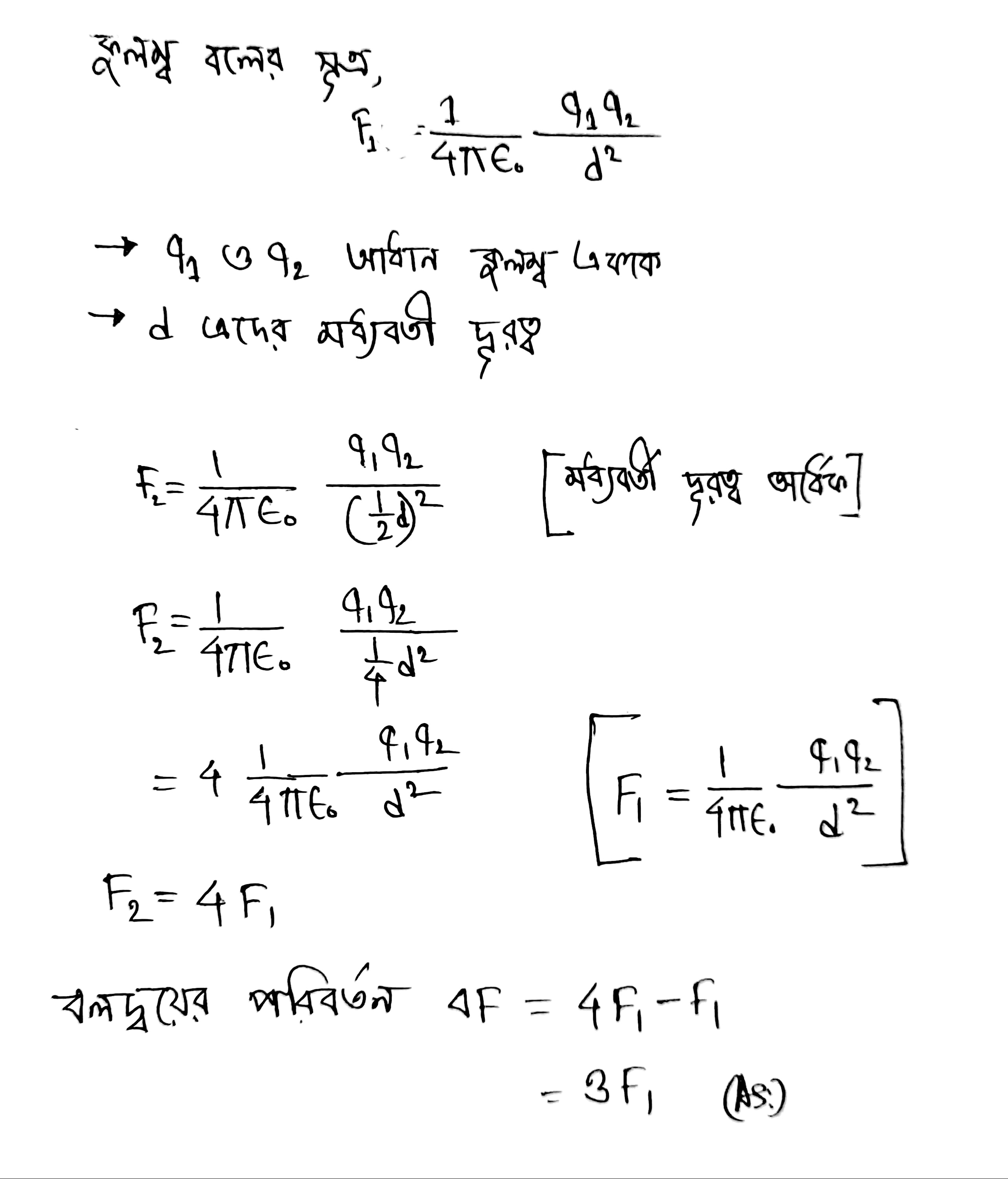 দুটি চার্জের মধ্যবর্তী দূরত্ব 1/2 গুণ করলে এদের মধ্যকার বলের পরিবর্তন কত গুণ হবে?
