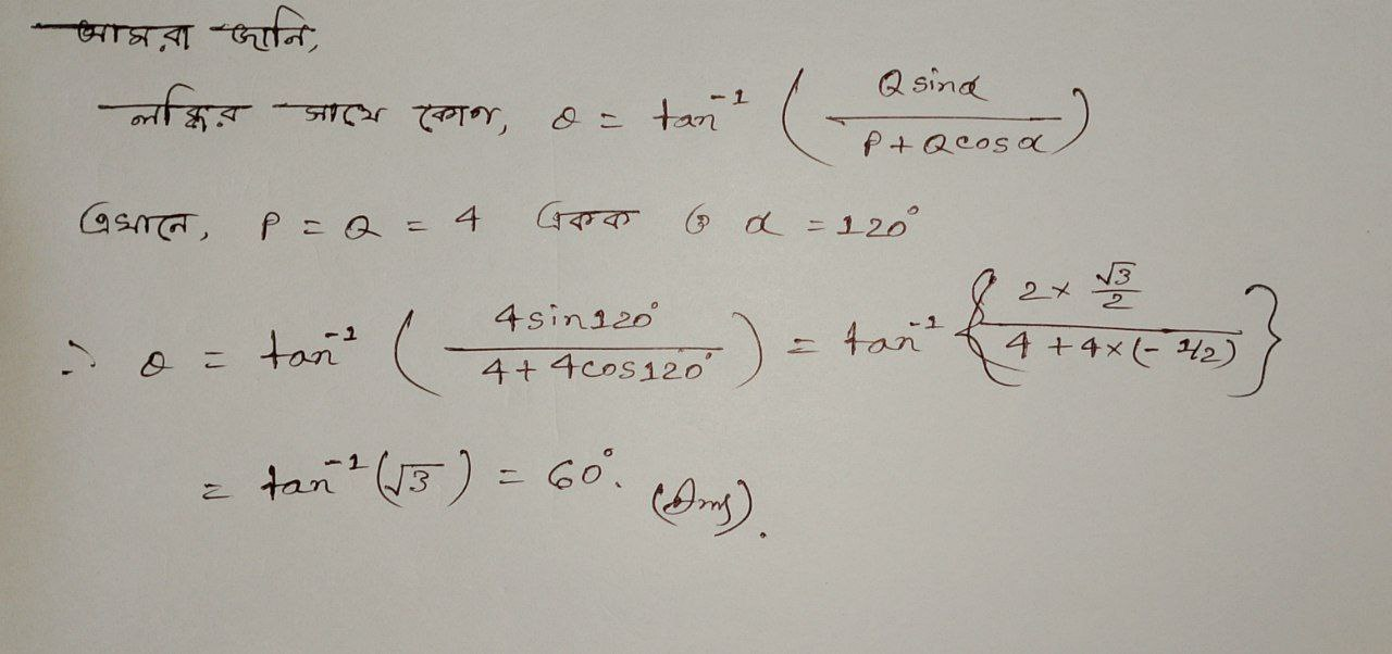 দুটি দিক রাশির প্রত্যেকটির মান 4 একক। এরা যে কোনো বিন্দুতে পরস্পরের সাথে 120° কোণে ক্রিয়াশীল থাকলে এক্ষেত্রে কোনো একটি ভেক্টরের সাথে লব্ধির কোণ কত হবে?