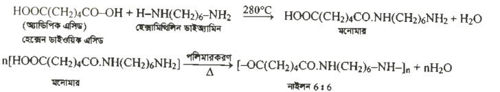 হেক্সামিথিলিন ডাইঅ্যামিনের জলীয় দ্রবণের সাথে ক্লোরোফরমে দ্রবীভূত অ্যাডিপিক এসিডকে (ছয় কার্বনের ডাইকার্বক্সিলিক এসিড) উত্তপ্ত করলে প্রথমে ঘনীভবন বিক্রিয়ায় নাইলন 6:6 এর মনোমার বা কো-পলিমার উৎপন্ন হয় এবং পরে তা থেকে পলিমারকরণ প্রক্রিয়ায় নাইলন- 6:6 উৎপন্ন হয়।