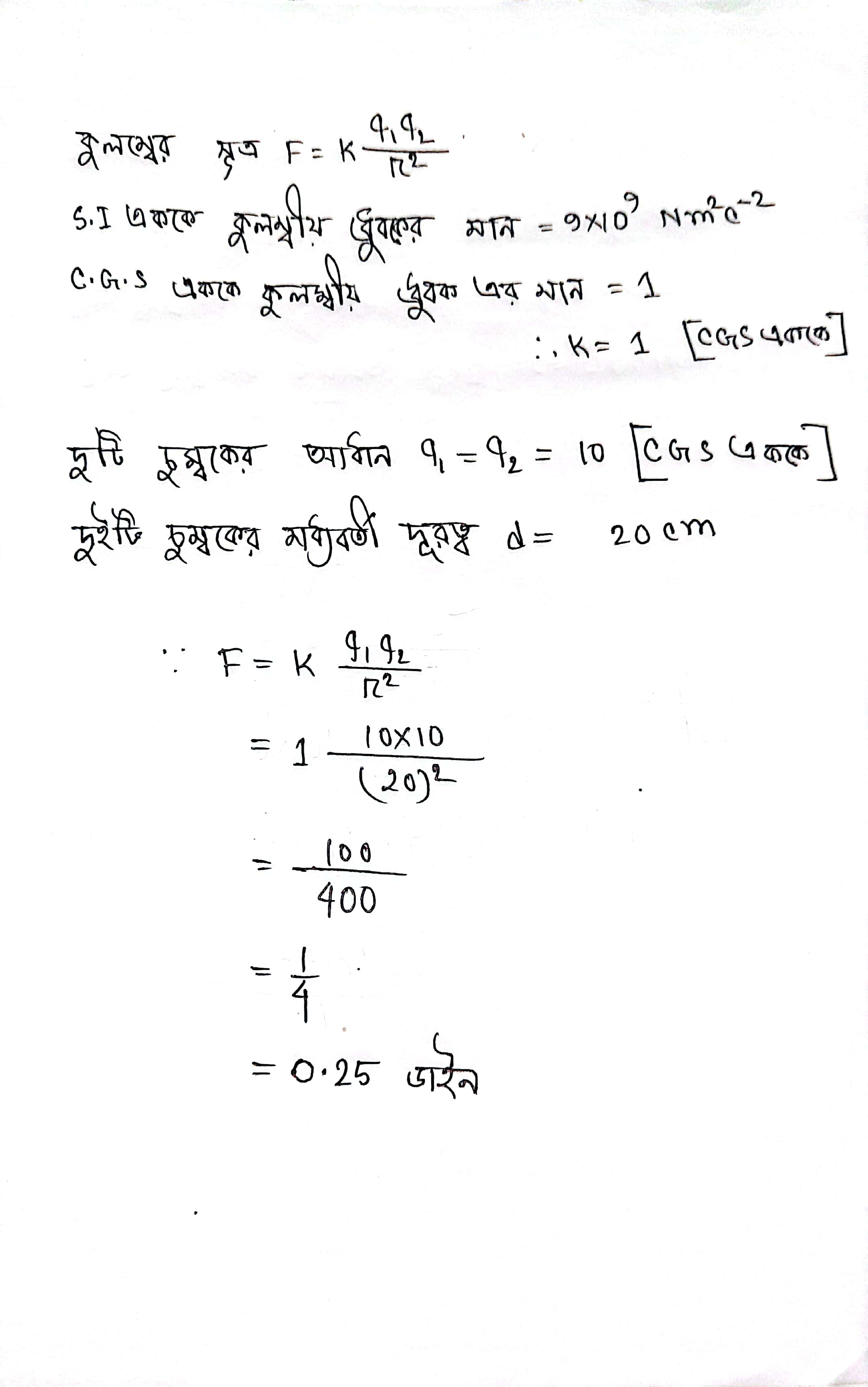 প্রত্যেক ১০ একক শক্তির (CGS) দুইটি উত্তর মেরু ২০ সে.মি. ব্যবধানে অবস্থিত। উভয়ের মধ্যকার বিকর্ষণ জনিত বলের মান-