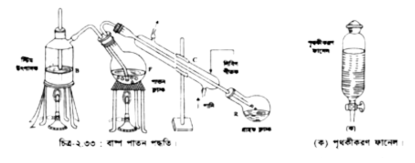 বর্ণনা: গোলতলি ফ্লাঙ্কে (F) অল্প পানিসহ অনুদ্বায়ী ভেজাল মিশ্রিত জৈব যৌগের মিশ্রণ নিয়ে এর সঙ্গে এক পার্শ্বে স্টিমের আগম-নল ও অপর পার্শ্বে উদ্বায়ী বাষ্পের নির্গম-নল এর সঙ্গে লিবিগ শীতক যুক্ত করা হয় (চিত্র-২.৩৩)। শীতকের (C) শেষ প্রান্তে গ্রাহক পাত্র থাকে। গোলতলি ফ্রাঙ্কটিকে স্টিম উৎপাদক পাত্রের দিকে একটু হেলান অবস্থায় রেখে স্টিম চালনা করা হয়, যেন স্ফুটনকালে লাফ দিয়ে নির্গম-নল পর্যন্ত তরলটি পৌঁছতে না পারে। স্টিম উৎপাদক (B) ও পাতন ফ্লাস্কে (F) এমনভাবে তাপ দেয়া হয় যেন পাতন ফ্লাঙ্কে প্রবিষ্ট ও তা থেকে নির্গত বাষ্পের পরিমাণ প্রায় সমান থাকে। গ্রাহক ফ্লাস্কে (R) সঞ্চিত জৈব যৌগের সঙ্গে পানিও জমতে থাকে। তাই কঠিন অদ্রবণীয় জৈব যৌগকে পৃথকীকরণ ফানেলের সাহায্যে পৃথক করা হয়।