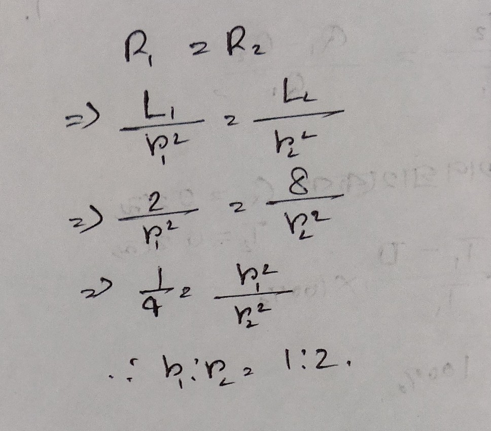 সমান রোধবিশিষ্ট দুটি তামার তারের দৈর্ঘ্য যথাক্রমে 2m ও 8m। তার দুটির ব্যাসার্ধের অনুপাত কত?