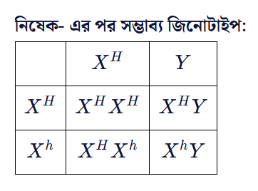 তাদের কন্যার জিনোটাইপ হবে , কারণ সে মায়ের কাছ থেকে একটি স্বাভাবিক ক্রোমোজোম এবং বাবার কাছ থেকে একটি হিমোফিলিক ক্রোমোজোম পাবে। এই কন্য৷ বাহক হবে, কিন্তু রোগাক্রান্ত হবে না।এখন, এই বাহক কন্যার সাথে স্বাভাবিক পুরুষের বিবাহ হলে তাদের সন্তানদের জিনোটাইপ কী হতে পারে, তা দেখা যাক: